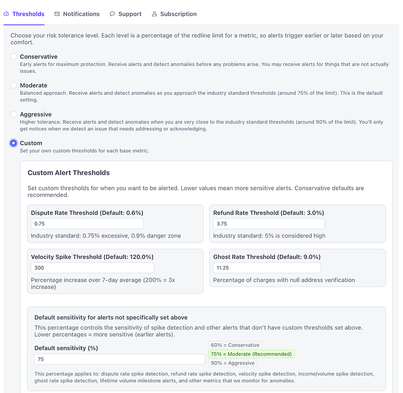 If you are a subscriber, you can also select 'Custom' and tune the core metric thresholds to your liking, as well as add a scalar percentage for all the other metrics we monitor. If you set the 'Default Sensitivity' value to '50', we will send out alerts when a metric reaches 50% of the 'danger' value. If you set the 'Default Sensitivity' to '90' you won't receive an alert for a metric until that metric is at 90% of the danger. value.